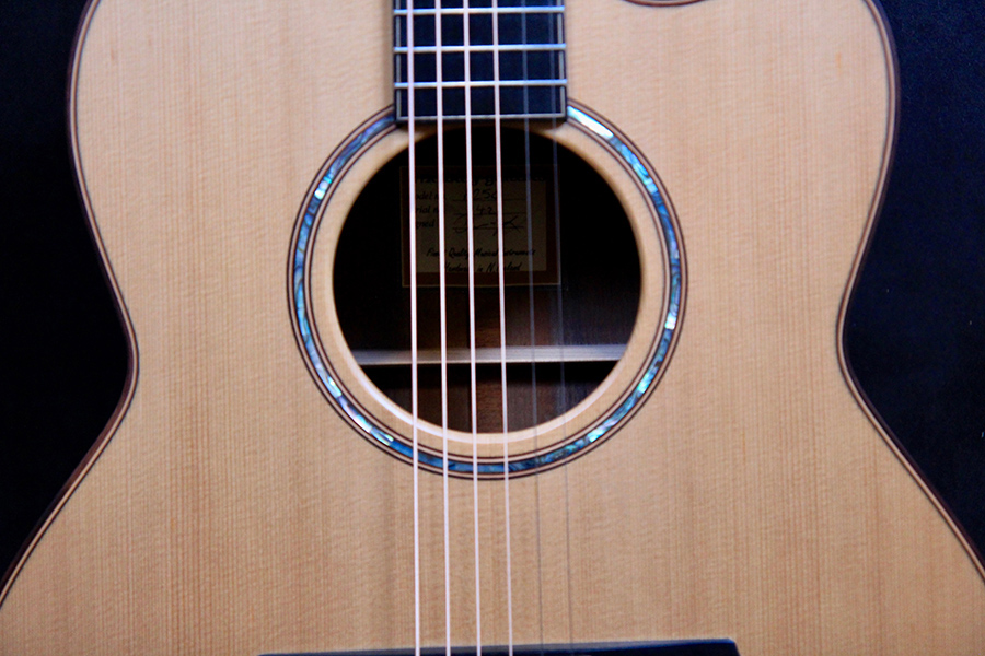 - Rosette: Paua Abalone with Rosewood and Pear Purfling inlays